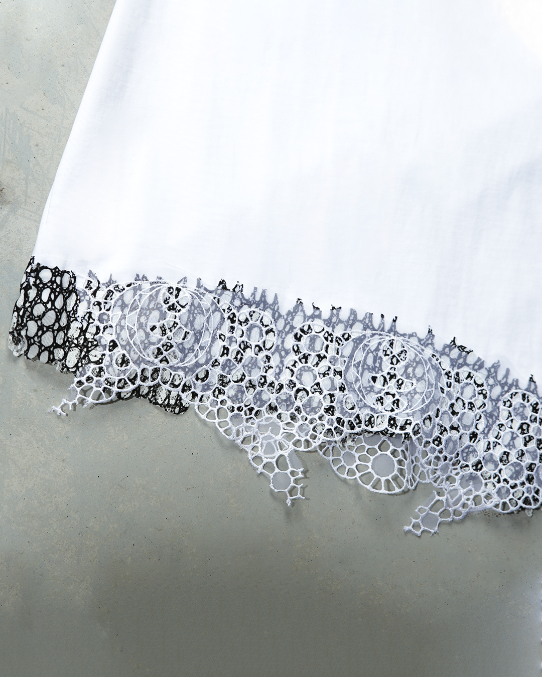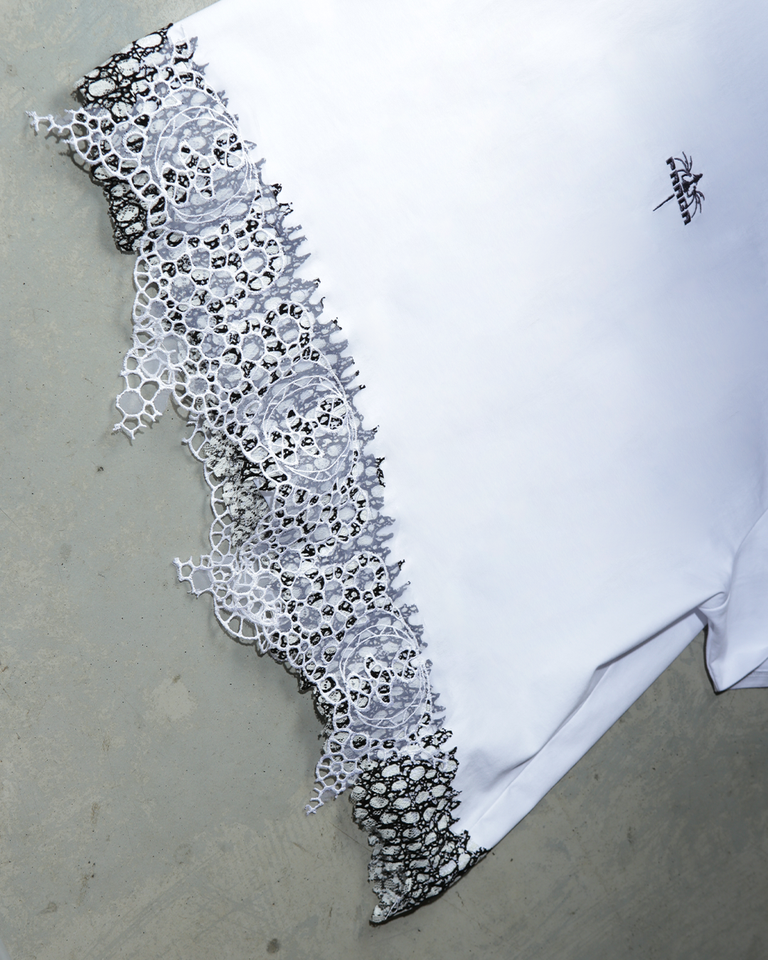 There is movement even in stillness. Lace traces the hem in sculpted symmetry, evoking the wings of a dragon mid-flight or the spires of an ancient citadel. On the back, a dragon holds its form in silence. It is a wearable artifact of the Praga Dragon legacy.